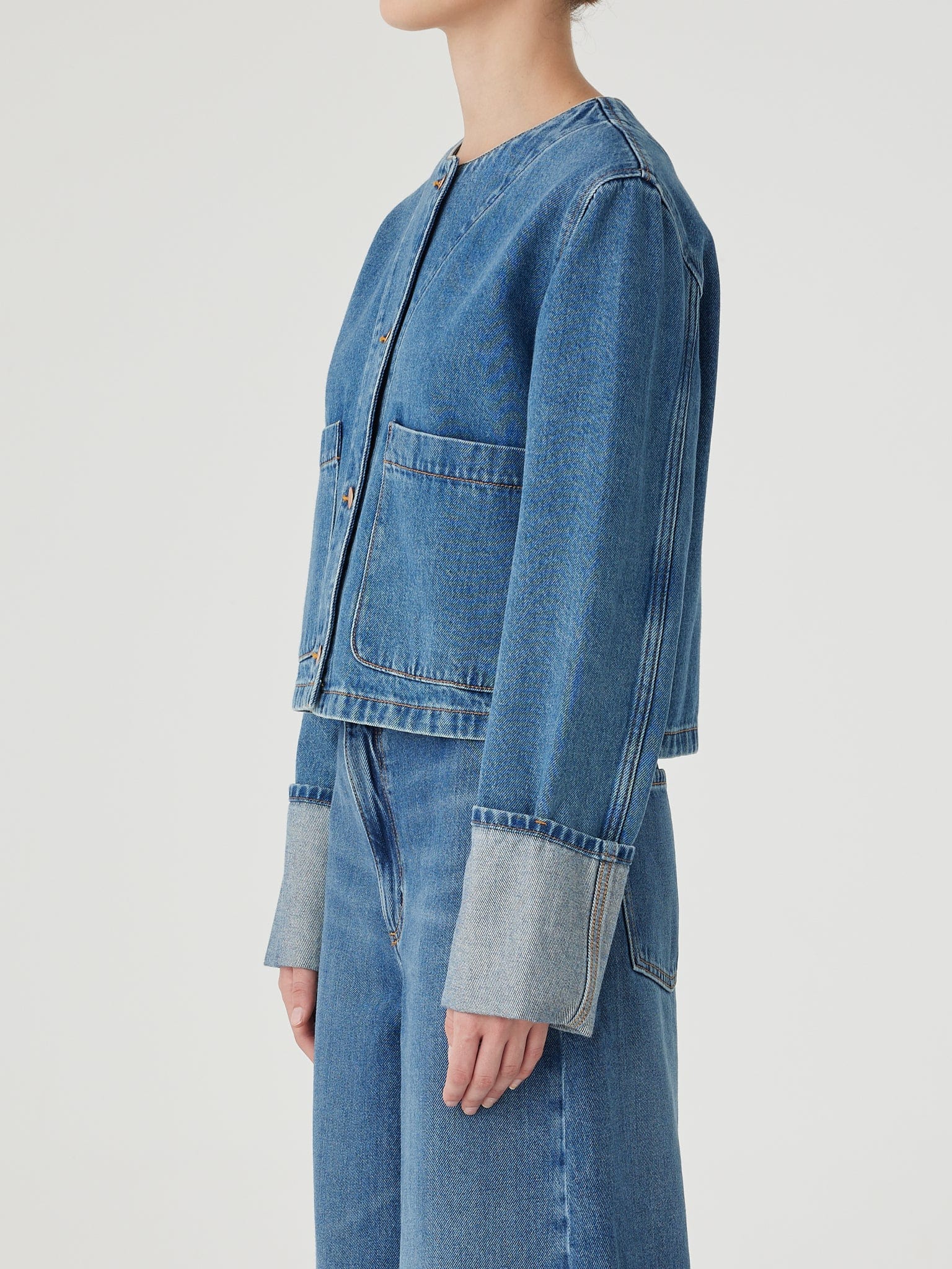 Our collarless denim jacket. The Brooke Jacket is fitted at the shoulders and has a neat, slim-straight fit through the body, finishing at the hip. Featuring collarless styling, sleeves with deep cuffs and front patch pockets.