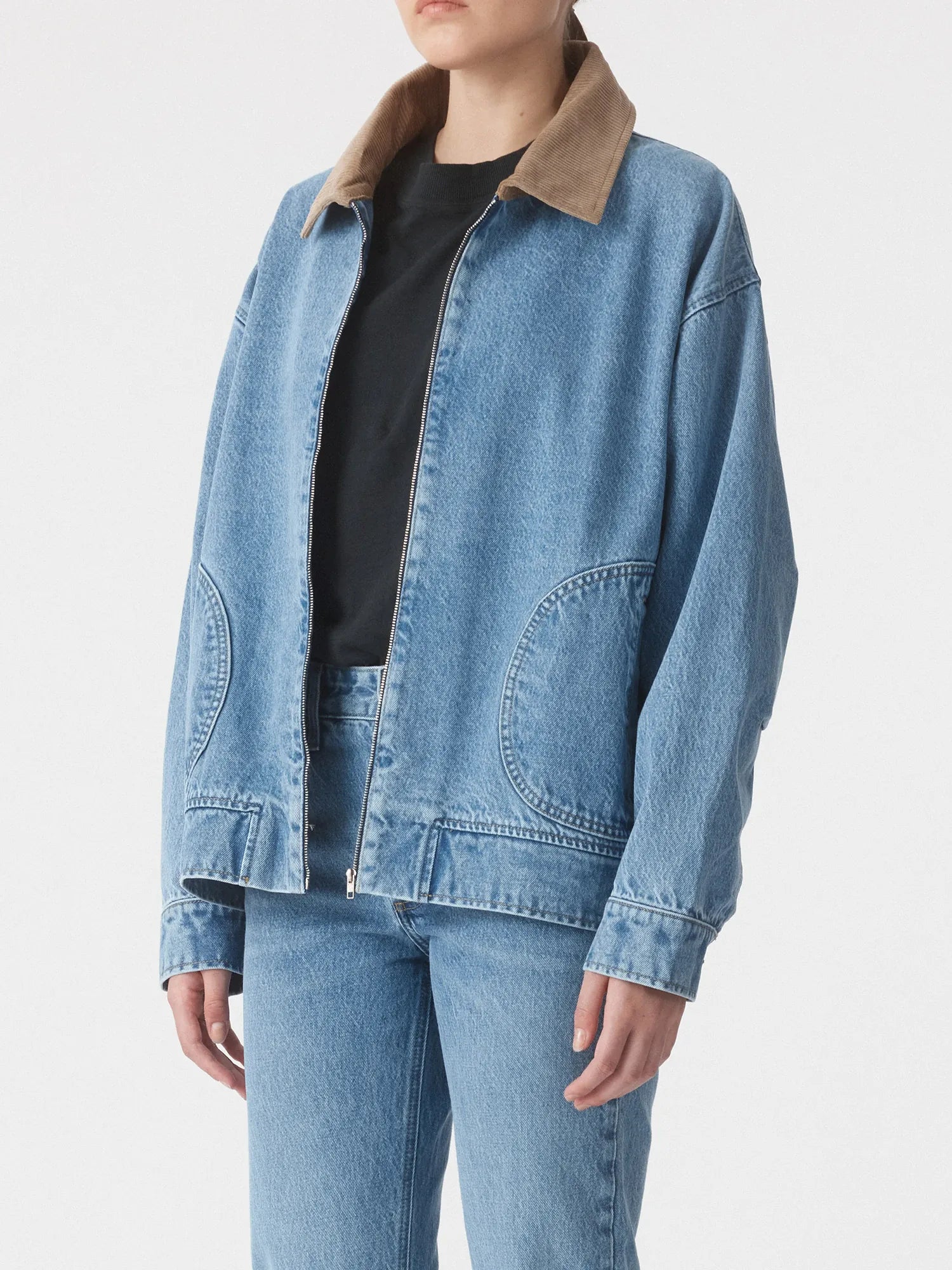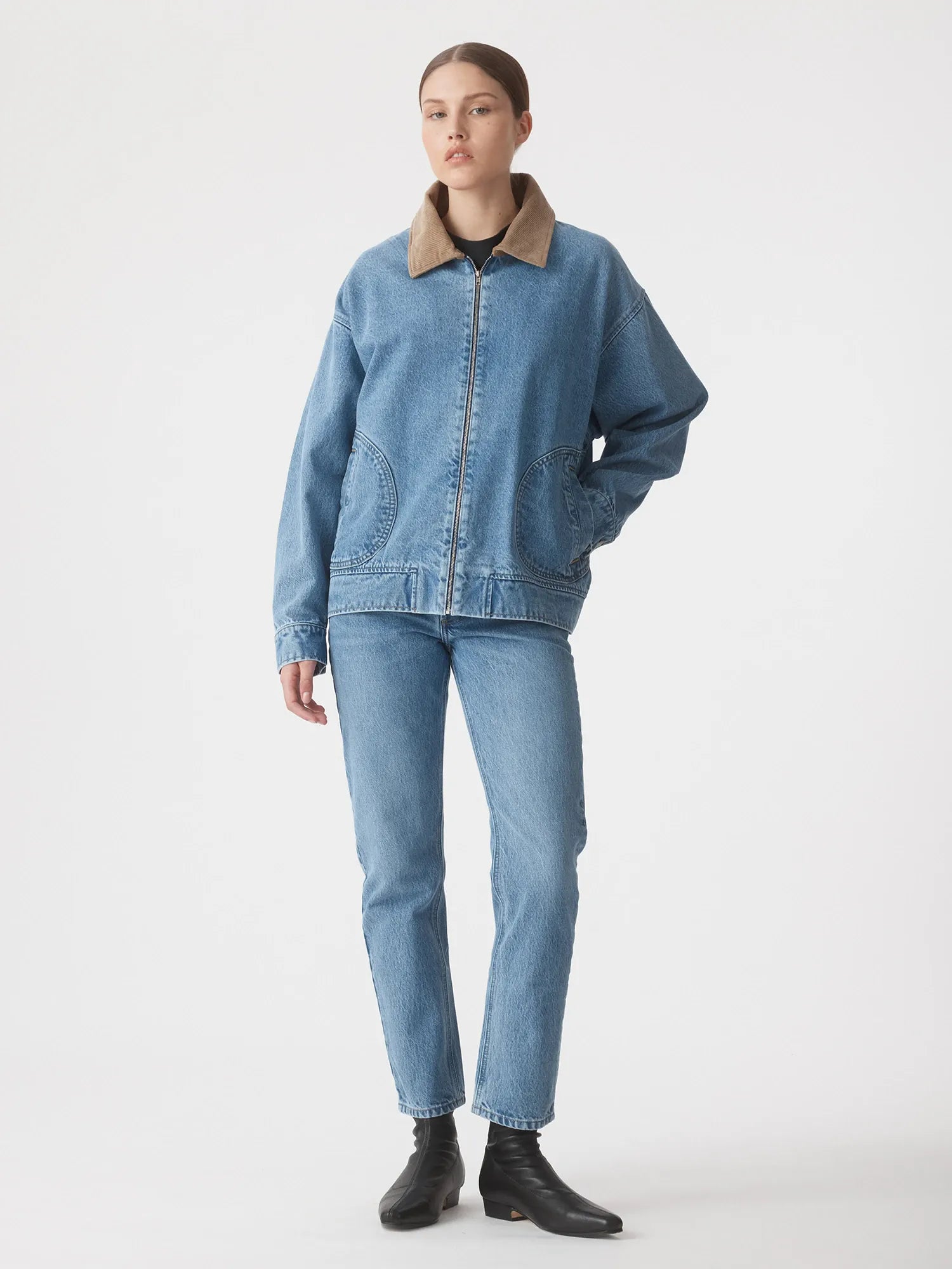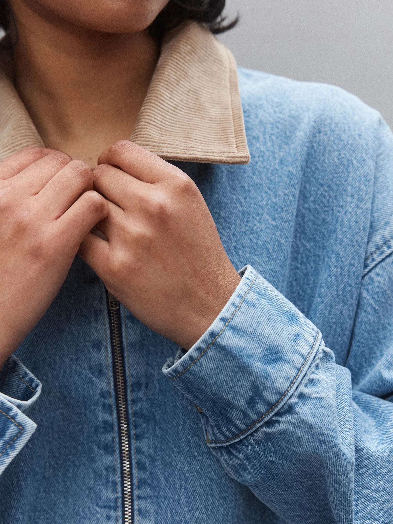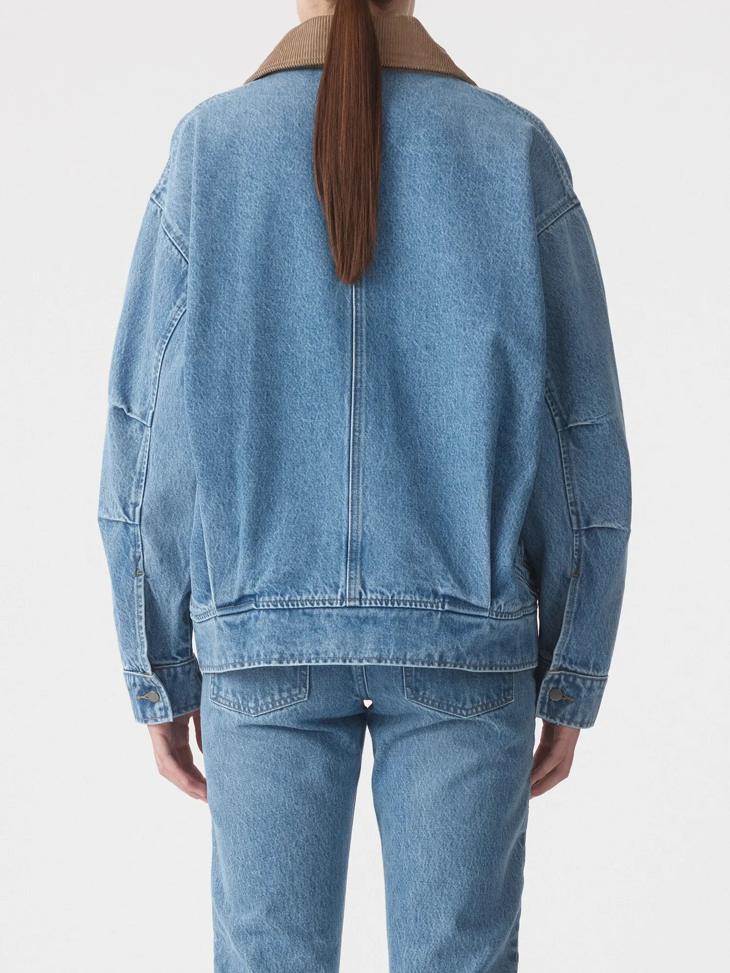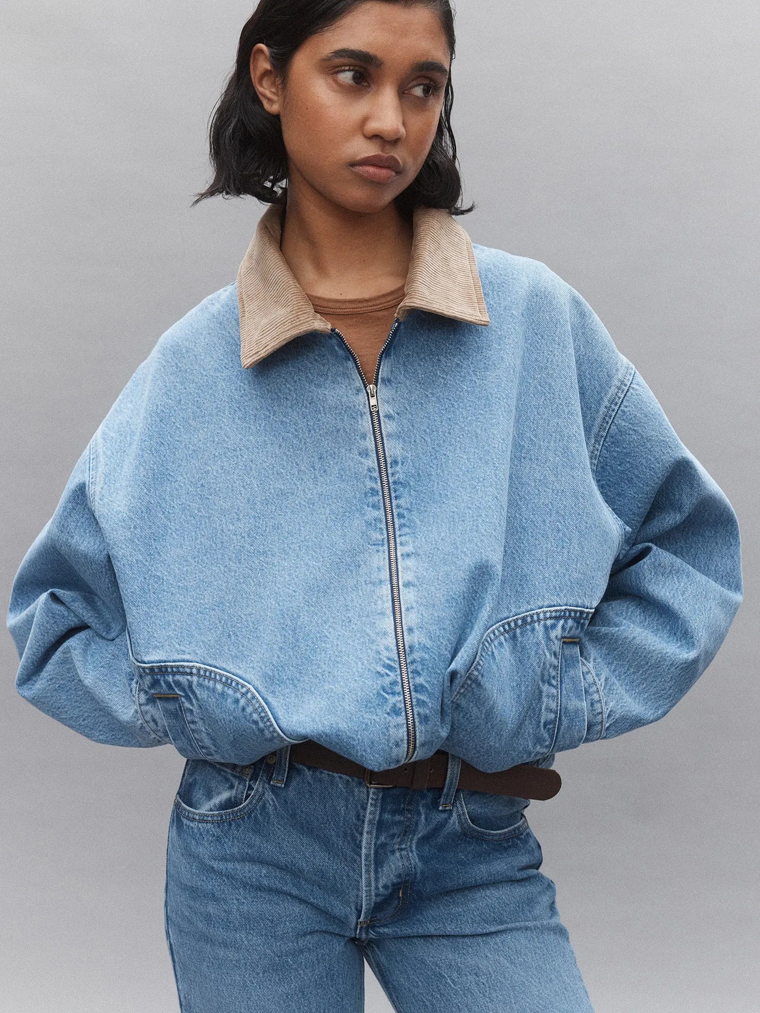 This is our oversed bomber jacket. The Gina has an oversized fit throughout, with oversized collar, zip front opening, patched welt pockets, and tucks at sleeves and back waist.