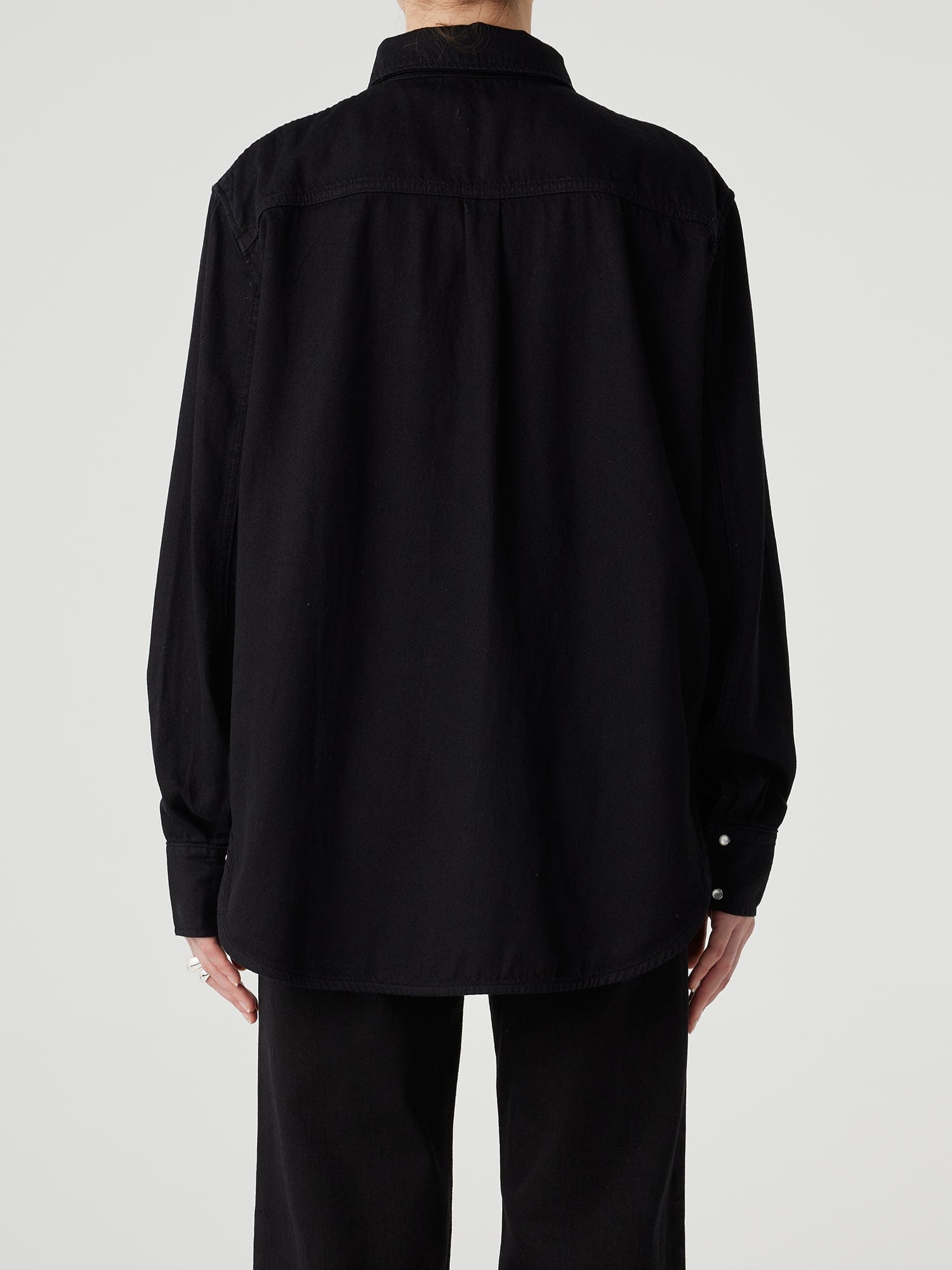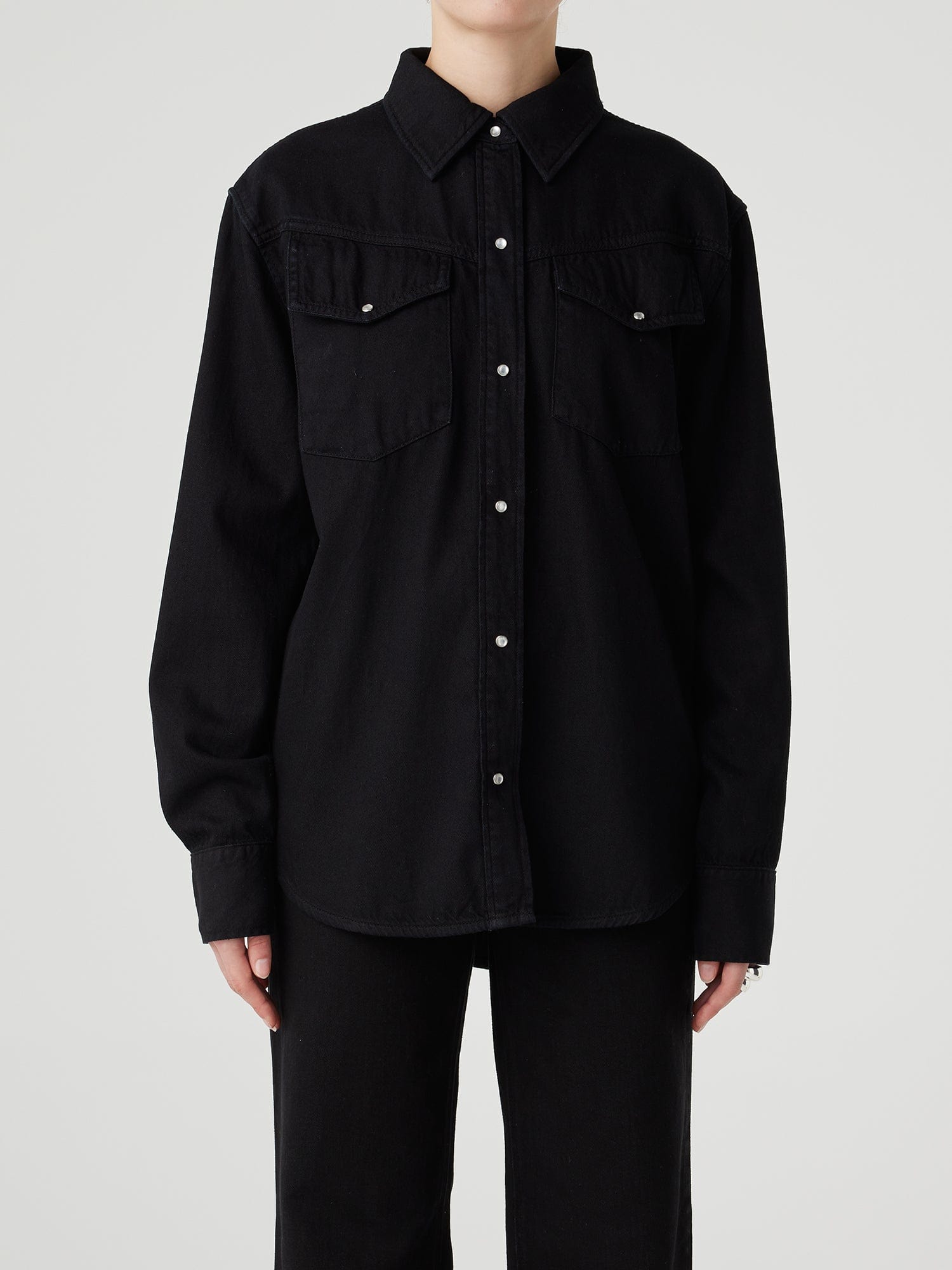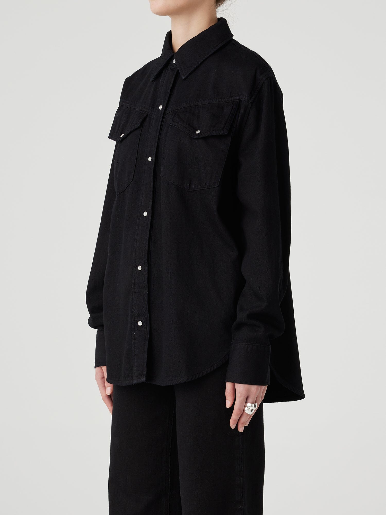 Our western denim shirt. The Kelly Shirt features a relaxed cut through the body, with angled front yoke and pocket detail and pearl snap fastenings.