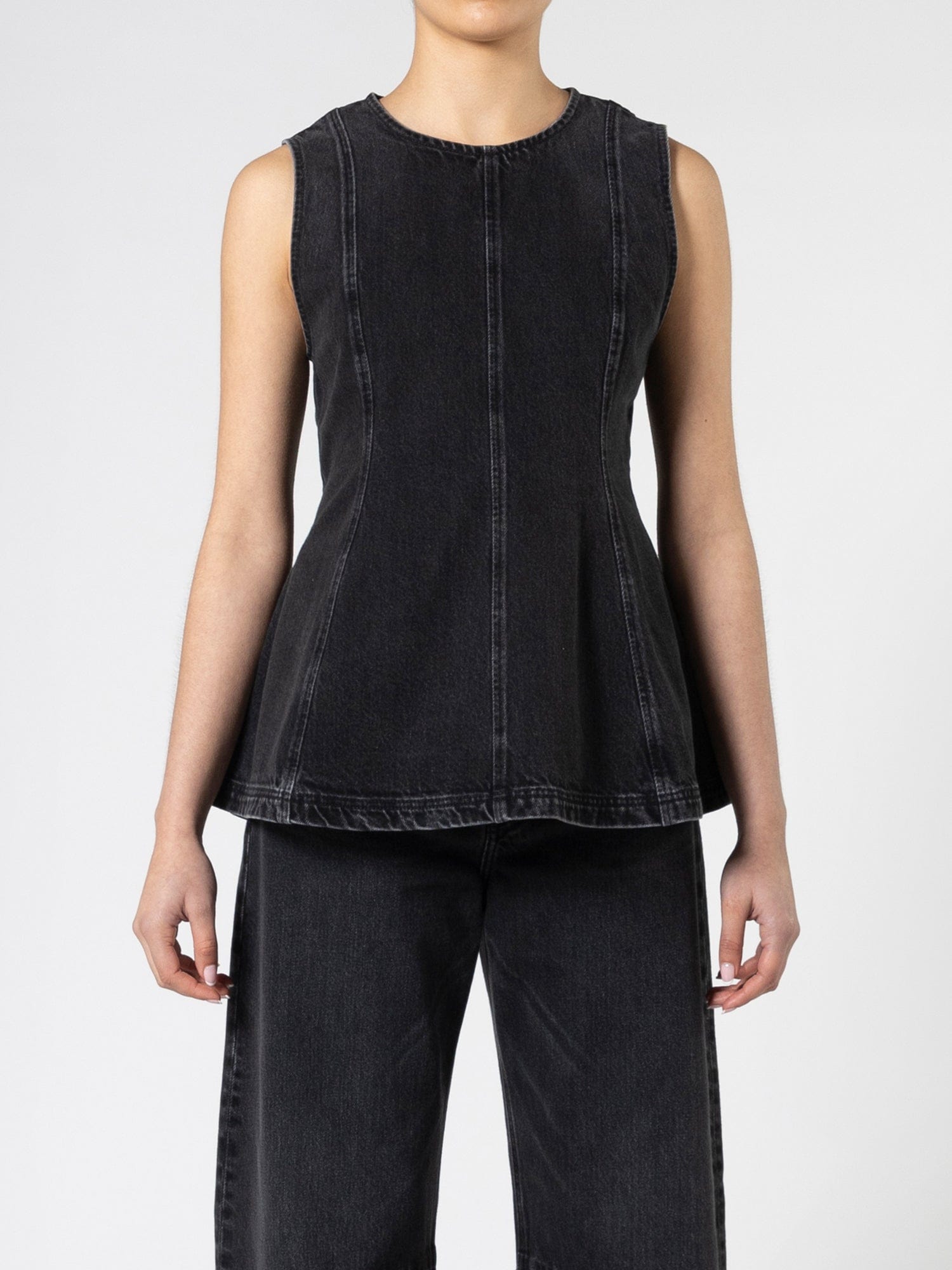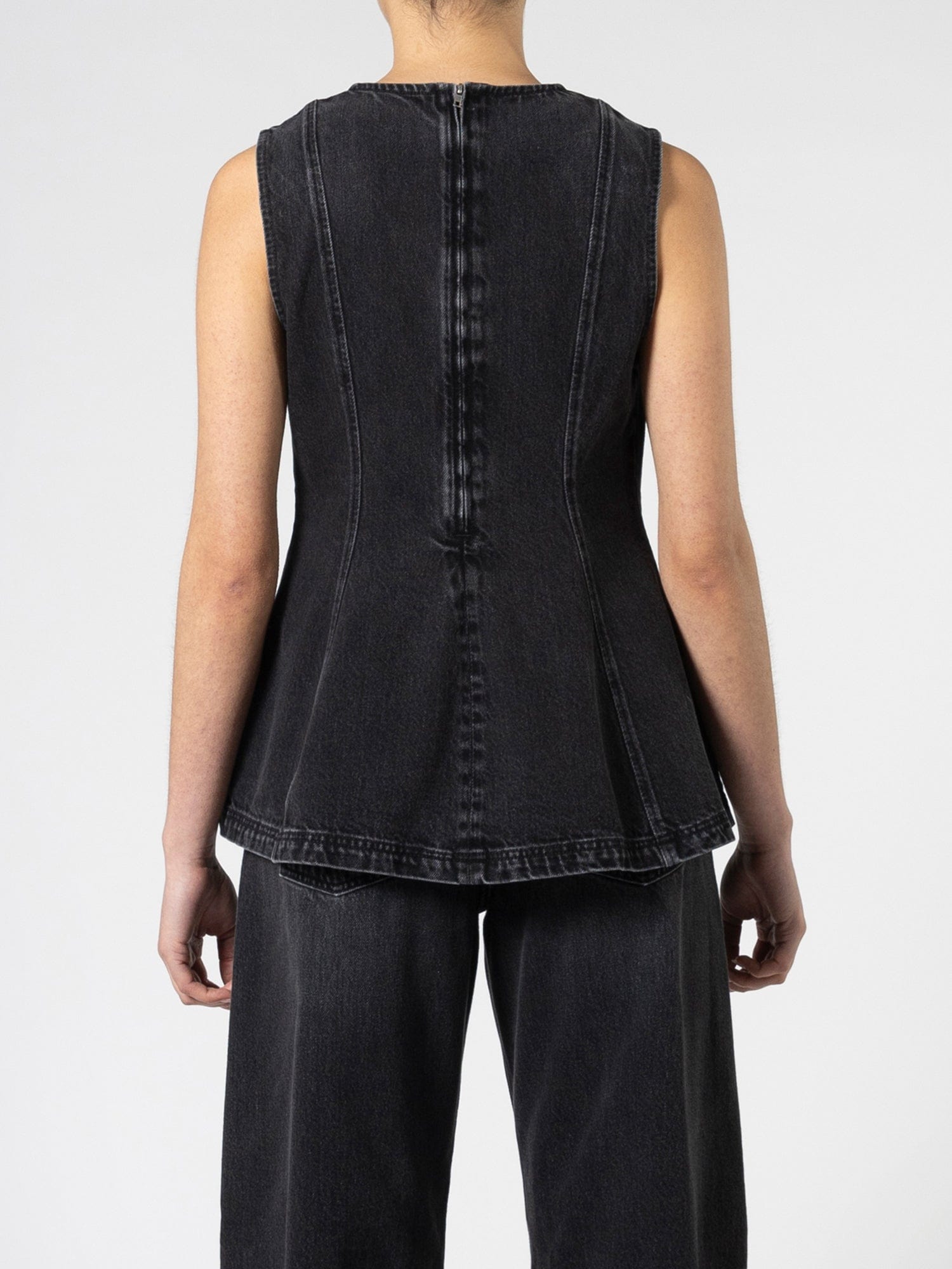 Our dreamy denim top. The Lucille Top is sleeveless, tapers in at the waist, then flares out at the hip for a unique hourglass silhouette. Featuring vertical seaming and back zip opening.