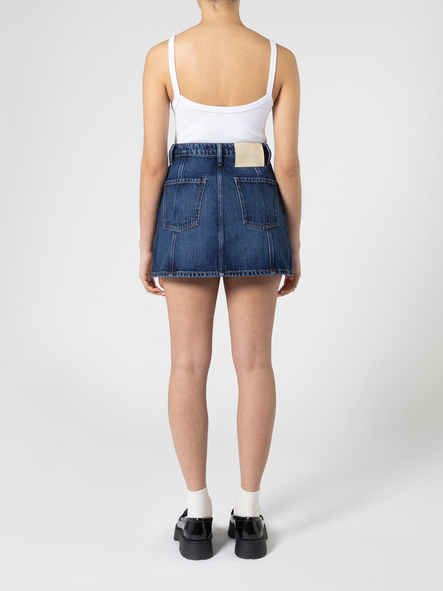 Our 90's throwback skirt. The Mika Skirt sits on the true waist, is fitted on the hip and follows an A-line silhouette to finish at the upper thigh. Featuring panel seams and welt pockets.