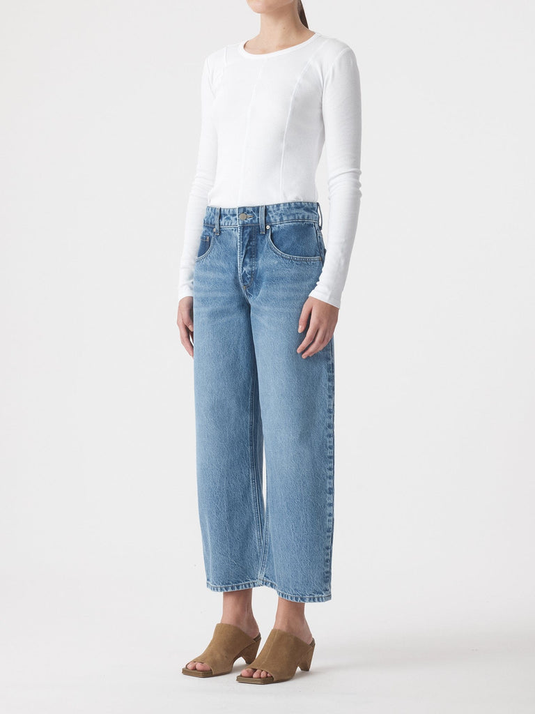 Our easy wide leg jean. The Nadia Jean sits below the navel, is relaxed through the hip and leg, with a curved wide leg profile and finishes at the ankle. Features a button fly. Made from premium rigid denim.