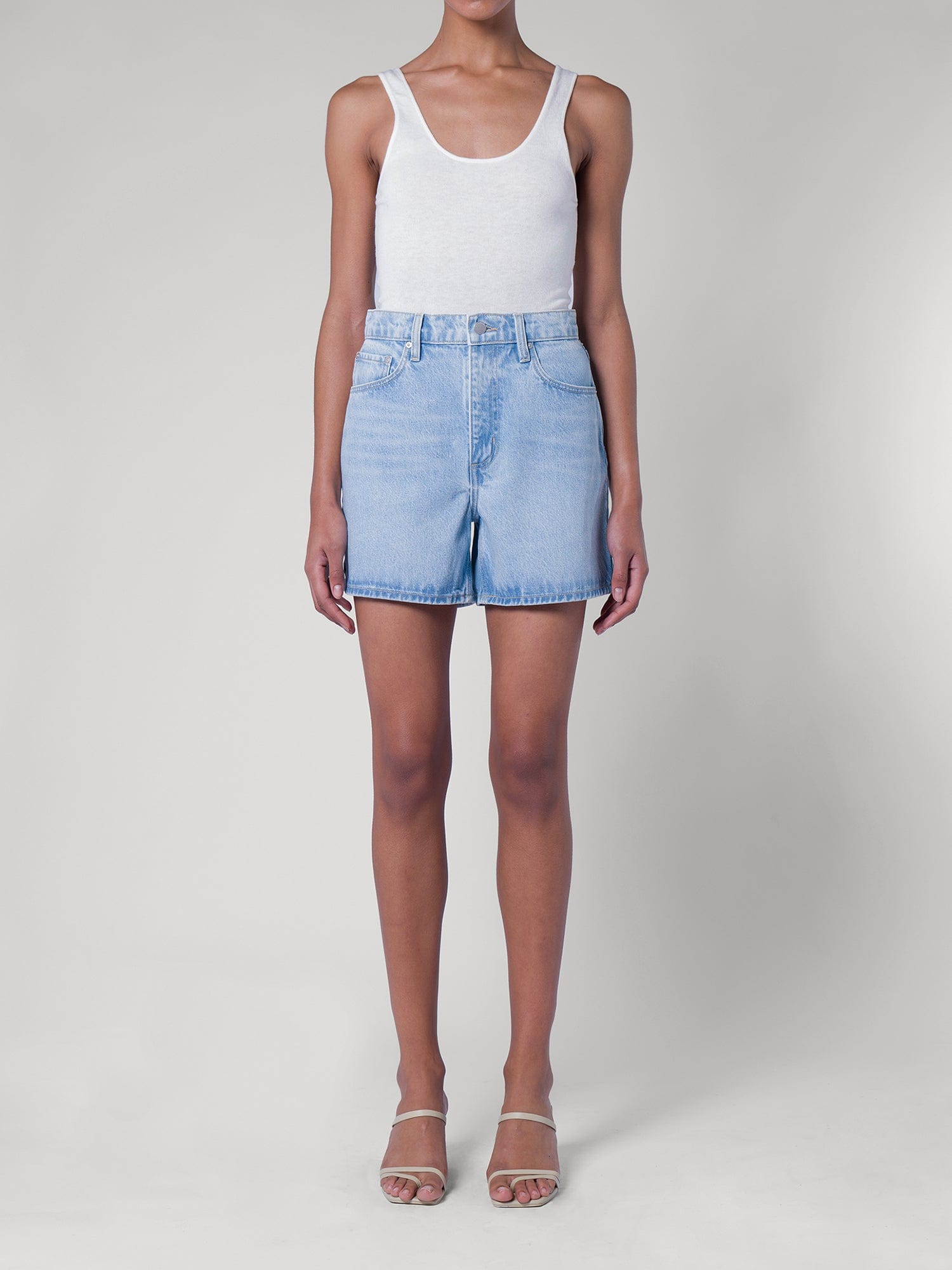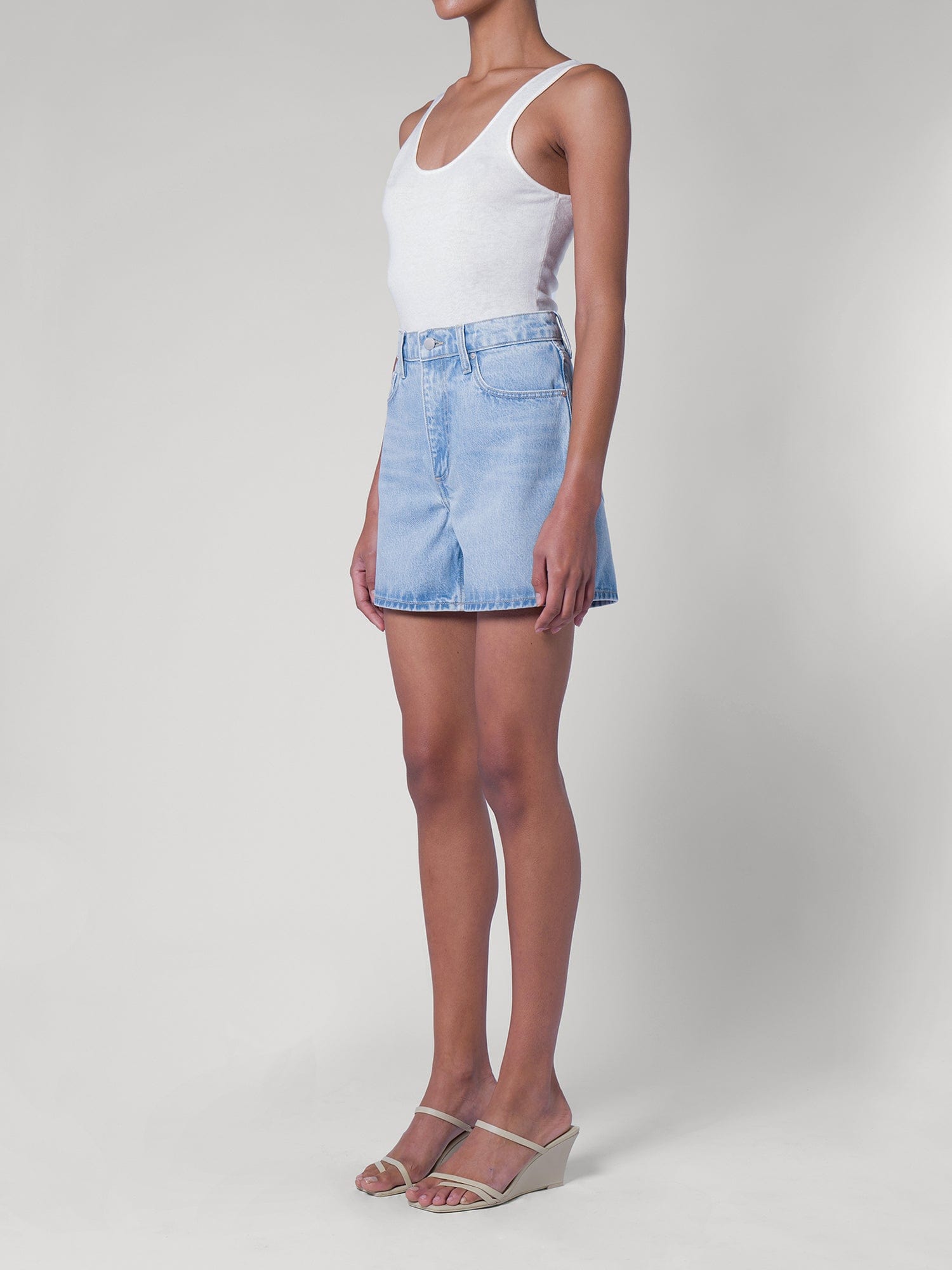 Our vintage A-line short. This short sits high on the true waist, is cut slim through the hip and widens to the thigh.